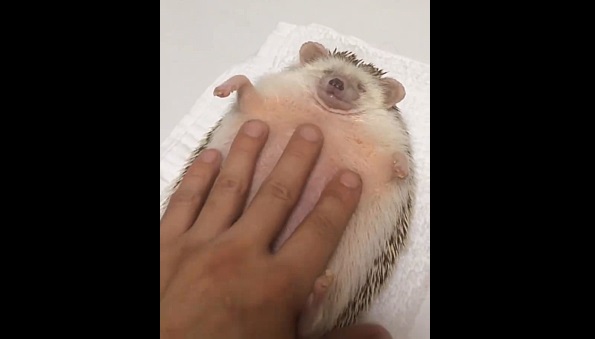 Když sedí na zádech na ručník, Ježek má masáž na břiše člověka. Málo času, relaxační.
