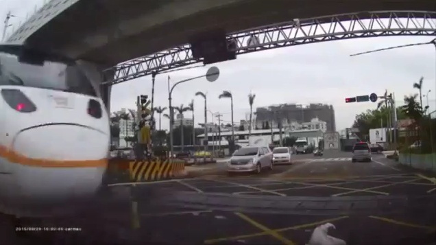 Pruhy na přejezdu v Taichung city Tchaj-wan jít dolů. Automobily nečekat předat vlak, ale nakonec jakýkoli vlak se nezobrazí a znovu stoupat pruhy. Auta pak jdou přes přechod, ale jeden z řidičů budou mít největší strach svého života, když se náhle objeví vlak a v závratné rychlosti „poškrábe“ přední část vozidla.