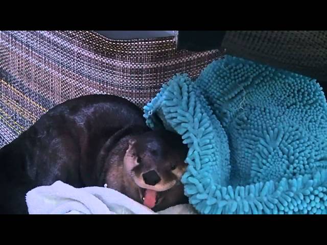 Vydra Ryer, spí pod dekou v akváriu zálivu San Francisco, Kalifornie. Právě slyšela jeho jméno, Hledám výše odpojit pár výkřiky nespokojenosti.