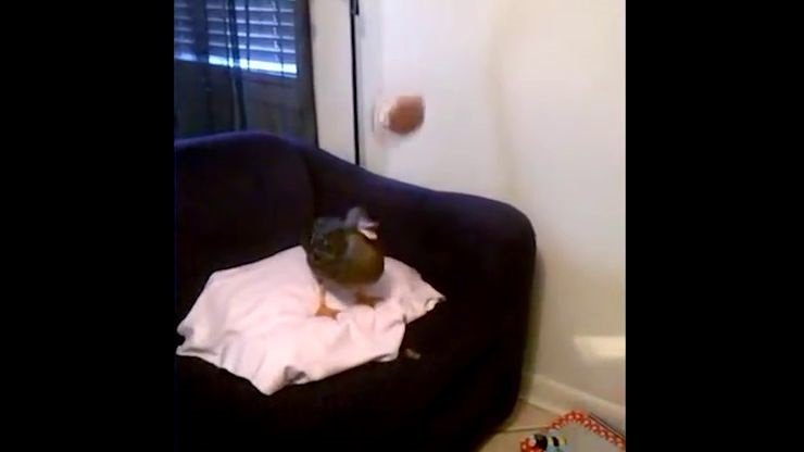Tato kachna bavilo hraní míče s holkou. Hravé kachna vrátí míč pokaždé, když, bít se zobákem z.