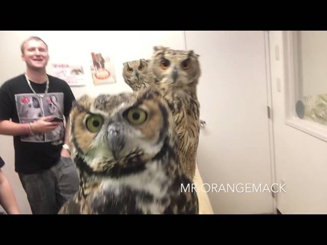 Kavárna Cafe Hirosaki sova v Japonsku, Hosté mají možnost splnit nějaké přátelské sovy zblízka. Tady, sovy se díváte na sebe před fotoaparátem mobilního telefonu.