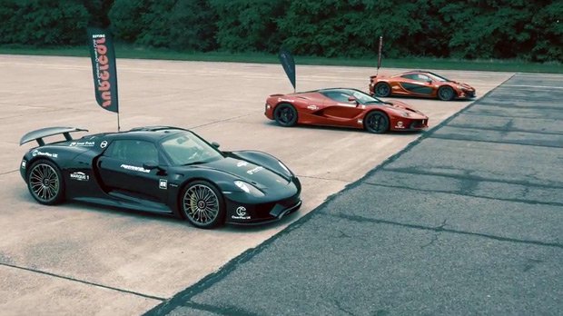 Britský McLaren P1, Italsky Německy laferrari a Porsche 918 Spyder, srazí v táhnout závodě, kde vítězné auto k dosažení první 300 km / h.