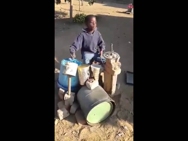 Dítě v Africe postavil provizorní drum kit pomocí plechovky, kameny a jiné předměty.