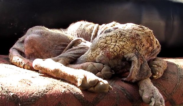 V Indii, Členové agentury pro péče o zvířata zvíře pomoci, zjistili, že pes putování do zadní části opuštěné tříkolka. V havarijním stavu, zvíře trpělo svrabem v pokročilém stádiu a jeho kůže 'zkameněla'.