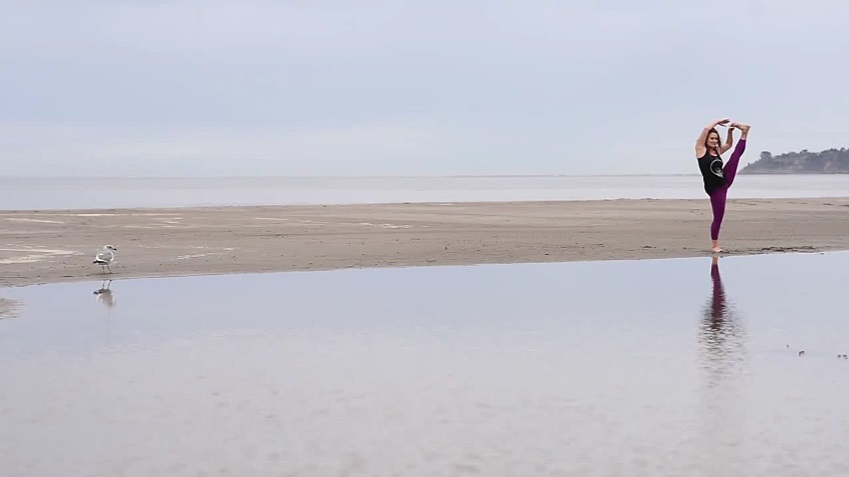 Racek se snaží napodobit pohyby ženy dělat jógu na pláži.