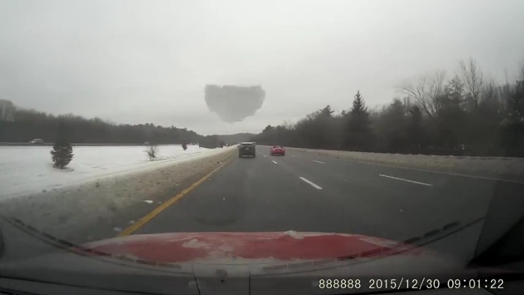 Tvrdá vrstva ledu listí ze střechy SUV a poškození stěrače a ovladače zrcadlo v autě 9-5 Aero vozu. K incidentu došlo 30. prosince, na dálnici v Massachusetts (Spojené státy americké).