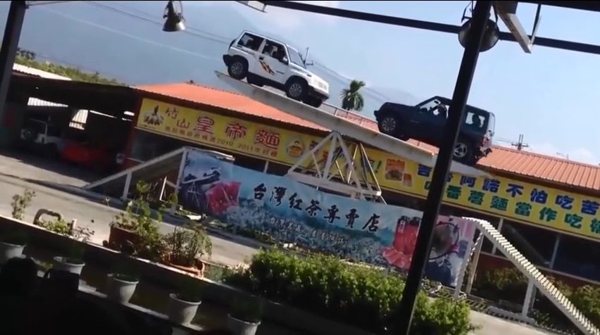 Původní akrobacii v Číně, se dvěma houpacími vozy 4×4 na kovové plošině.