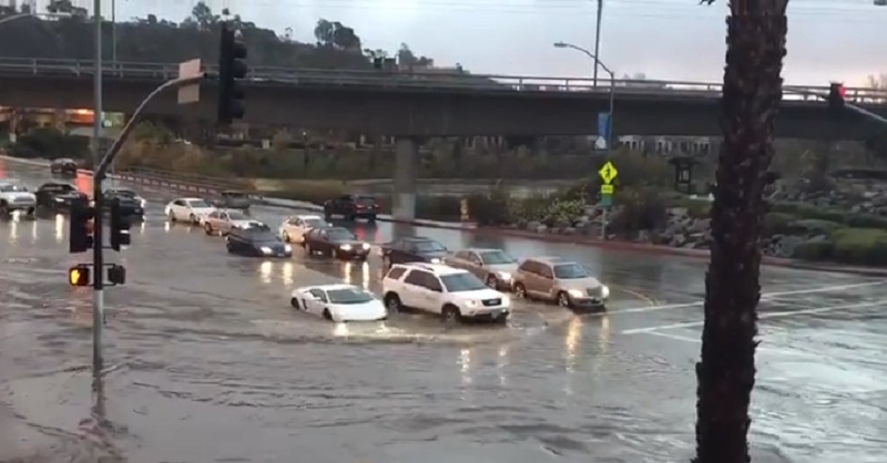 Po velké deště v San Diegu v USA, kamera zachytí automobily, které jezdí na zatopené ulice. Zatímco většina nenarazili na problém, voda se zdá být dostatečně hluboké pro Lamborghini Gallardo, která se stala téměř… pod vodou.