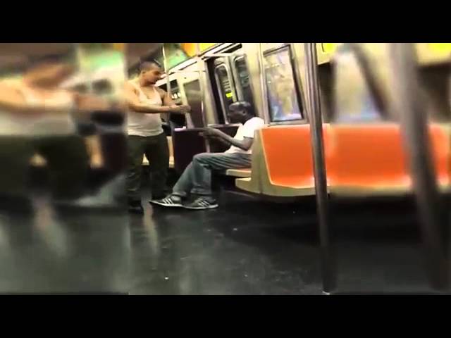 Muž v metru New York nabízí halenku a CAP v bezdomovec, která vstoupila polonahou vůz.