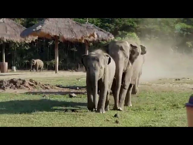 Elephant slon přírodní Park Park, v Thajsku Mae Taeng, malý slon La Kham spolu přátelství run pozdravit svého milovaného přítele Darrick, pečovatel o Park, který přijede na traktoru.