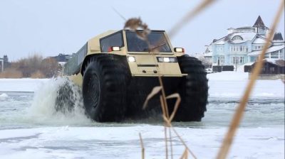 Působivá ukázka Sherp, ruský čtyřkolka, která může překonat překážky více než 70 cm na výšku a pohybují přes vodu. S délkou 3,40 , šířka 2,52 a výškou 2,30 metru, Sherp ATV je vybavena pohonem na obrovské kotouče.