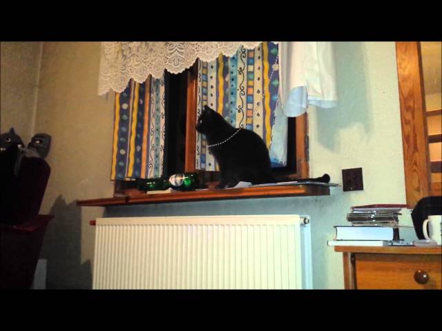 Kočka se připravuje na skok z římsu okna, bez velkého úspěchu.