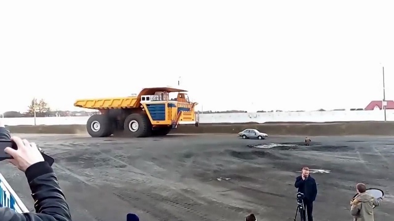 Belaz 75710, největší truck na světě, prochází přes auto. Skóre; Auto se stává zcela plochý, jako palačinka.