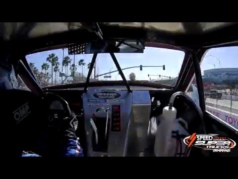 Pat O’Keefe vyráží na divokou jízdu během 2016 Long Beach Stadium SUPER Trucks Race.
