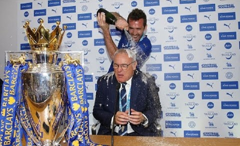 Trenér Leicesteru Claudio Ranieri náhle „zaútočil“ šampaňským jeho hráči během tiskové konference, kdy se v sobotu 7. května předávala trofej Premier League.
