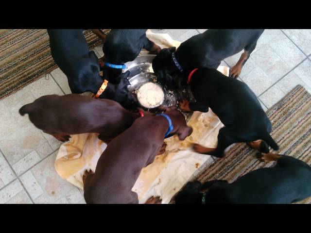 7 štěňat dobrmanů si pochutnává na jídle, Při spřádání kruhově kolem mísy.
