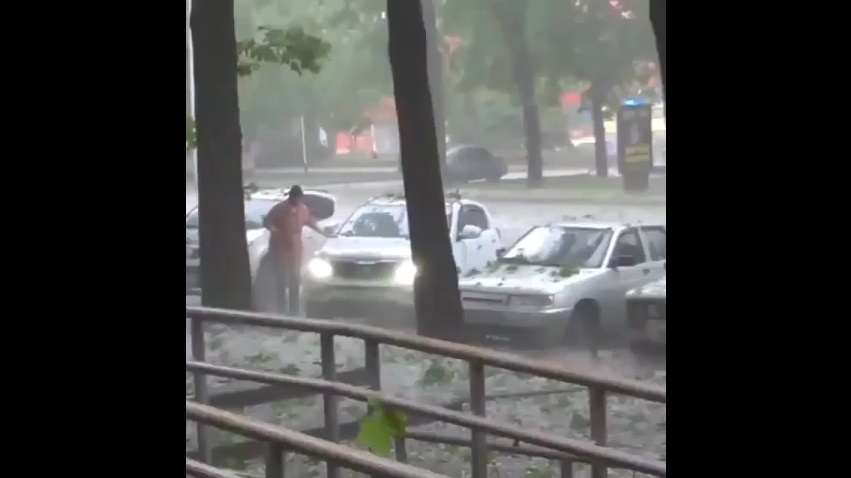 Muž v Rusku snaží chránit svůj vůz před silným krupobitím, v jistém smyslu paradoxní.