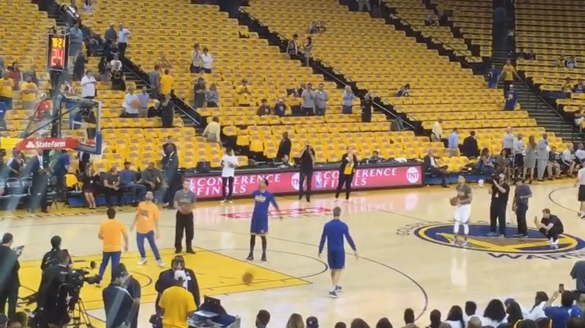 Během rozcvičení před utkáním proti Oklahoma City Thunder, o Stephen Curry činí pět střelu do středu pole.