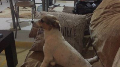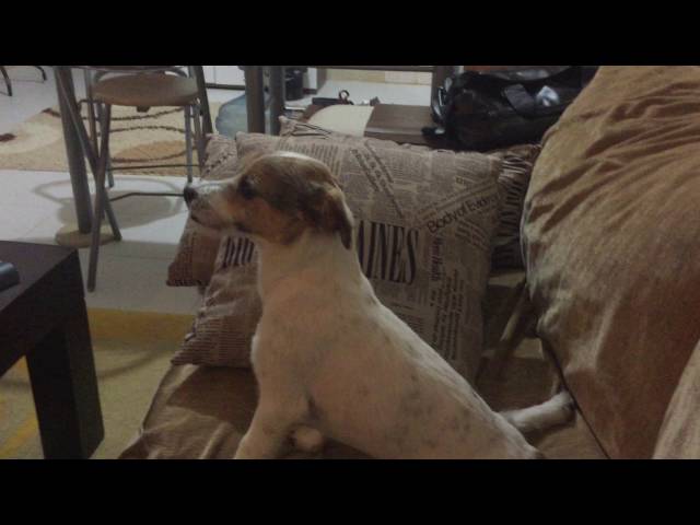 Sedí na gauči, Milo Jack Russell sleduje horor 'The Conjuring' se svým šéfem. Pes je velmi pozorně sleduje, ale když vidím děsivá tvář na obrazovce, skrývá strach za polštář.