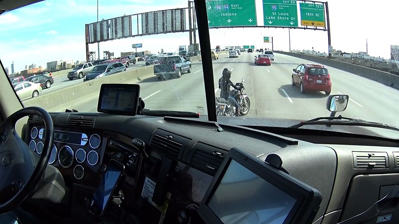 Trucker pomáhá žena s poškozením motocyklu, na dálnici nedaleko Chicaga, Illinois. Zastavil svůj vůz za ní, aby ji ochránil a postupně přesune vozidlo, aby je mohl pohybovat bezpečně na silnici.