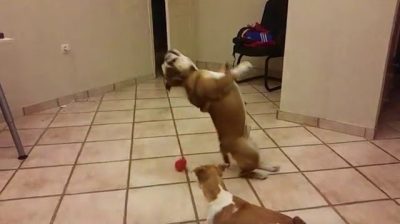 Medvídek buldoci se selhání zpětného kotrmelec snaží chytit míč.