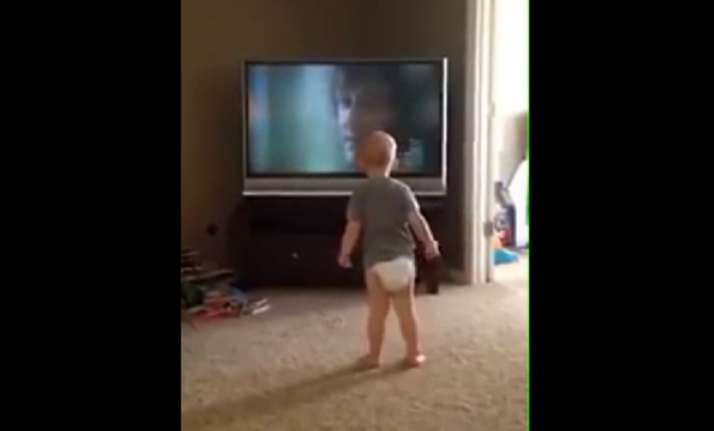 Dítě napodobuje cvičení Rocky Balboa v televizi.
