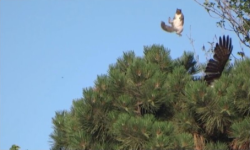 Na stromě, Sokol se snaží chytit veverka, ale dramaticky.