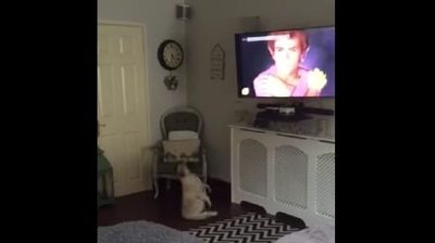 Minnie Wynne Bulldog odřeniny zadky podlahy do obývacího pokoje, budí dojem, že tančí v rytmu Whamovy skladby „Wake Me Up Before You Go-Go“ hrající v televizi.