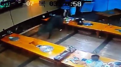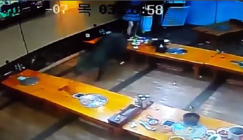 Bezpečnostní kamery v restauraci v Koreji, zaznamenejte čas, divočák vstoupí do místnosti a strach útočící zákazníků, kteří se snaží vyvést. Prostor je zničen za pár vteřin.
