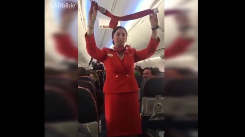 Letuška rozptylováni fotbaloví fanoušci, Jak to dává pokyny k bezpečnosti letadla ruské letecké společnosti Aeroflot. Během ‘ celý proces, mladá žena, která se snaží zůstat vážný s hlučné povzbuzování cestujících, ale nakonec selže a unášení z přátelské atmosféry.