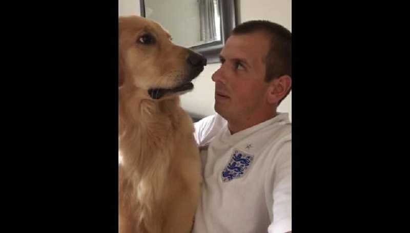 Vtipné reakce zlatý retrívr, Když jeho šéf mu řekne, že se stane malého bratra.
