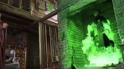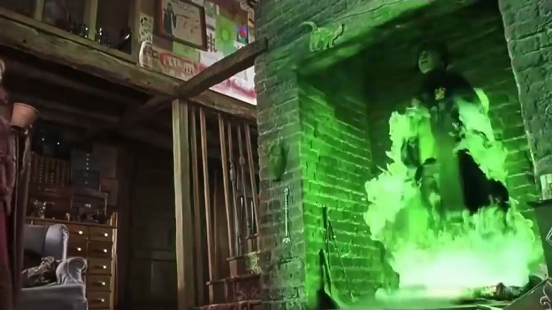 Harry Potter prožívá první floo powder (Harry Potter a tajemná komnata), Magický prášek, který umožňuje průvodci na teleport.