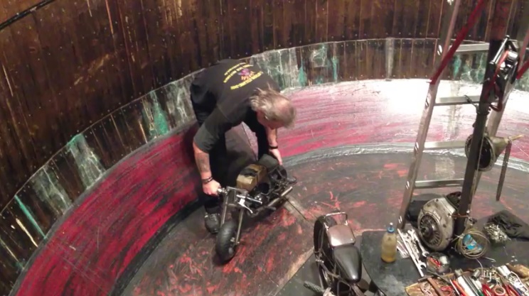 Kaskadér a Lengner Pit inženýr, předvádí slavný kousek „lap of death“ na úzké dráze na malé motorce.