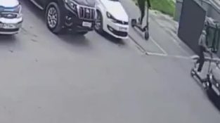 Stará žena na elektrické tříkolce se zhroutí dveřmi výtahu a spadne do šachty