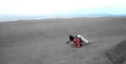 Potápěči se snaží plavat v jezeře Nahuel Huapi, pokryta hustou vrstvou sopečného popela z sopka Puyehue v Chile.