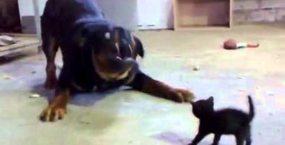 Já si nemyslím, že tento Rotvajler úmyslem poškodit na kotě, ale on stál ve výšce