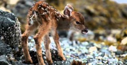 Novorozence jelen dělá své první krůčky v odjezdu Bay Beach, v Vancouver, Kanada.