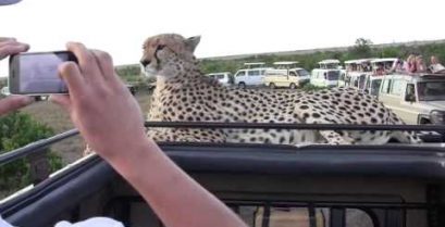 Gepard se rozhodne vyšplhat na palubu džíp s turisty v Masai Mara Kenias.