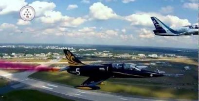 Ruští piloti týmu aerobatikis Team 'Russ' v působivá výstava k 100. výročí ruského letectví.