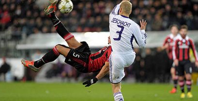Hráč AC Milán Philippe Mexes dosahuje velmi krásný gól nůžkami proti Anderlecht v včerejší zápas ligy mistrů. Zápas skončil 3-1 ve prospěch Milán.