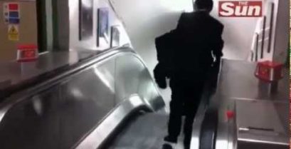 Opilý muž v metru, snaží se sestoupit eskalátory, které se rozbíhají. Někteří se snaží vysvětlit, že je ve špatné sekci, ale on je určen.