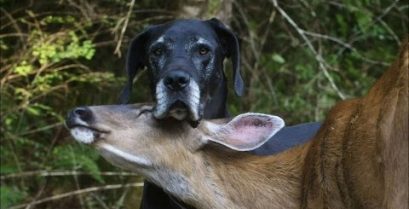 Po opuštění jeho matka, Tento malý Jelen byl přijat Kate, psí plemeno doga. Od té doby jsou nejlepší přátelé.