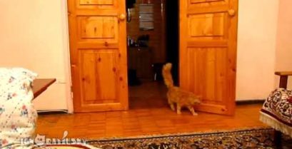 Kočka, která se obávala zvuk ve hře Super Mario na lyžích.