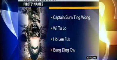 Jeden z největších omylů v zpravodajství, přišel z podvod stážisty na KTVU televizní sítě San Francisca, která dala údajně 'ověřená' jména korejských pilotů z letu 214 [...]