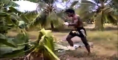Thajské atlet Muay Thai, Banchamek Buakaw, Trénuje s kopy na banánovník.