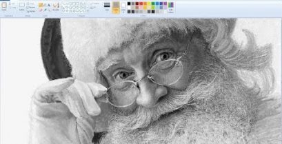 Tvář Santa Claus na Microsoft Paint programu Windows, zneklidňující detaily. Design byl proveden na tabletu a trval 9 hodin.