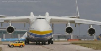Antonov 225, největší a nejtěžší letadlo vůbec postavena, kdy, startuje z letiště v Manchesteru. Antonov může vzlétnout s celkovou hmotností 640 tun a má šest motorů.