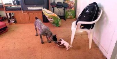 Santi je malé štěně, které nemá deign sdílet své jídlo s Saša, velký pes dům. Ochrání mísa každou cenu.