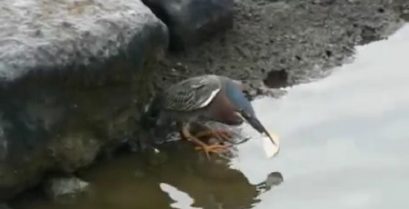 Chytré Egret používá kousek chleba jako návnadu chytit rybu.