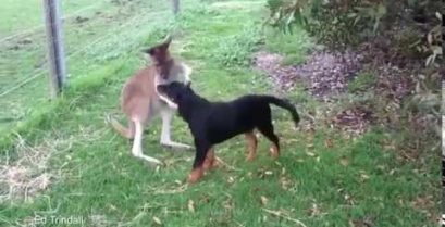 Modrý klokan a Trooper Rottweiler zůstat pohromadě na farmě v Perthu Austrálie a jsou velmi dobří přátelé.